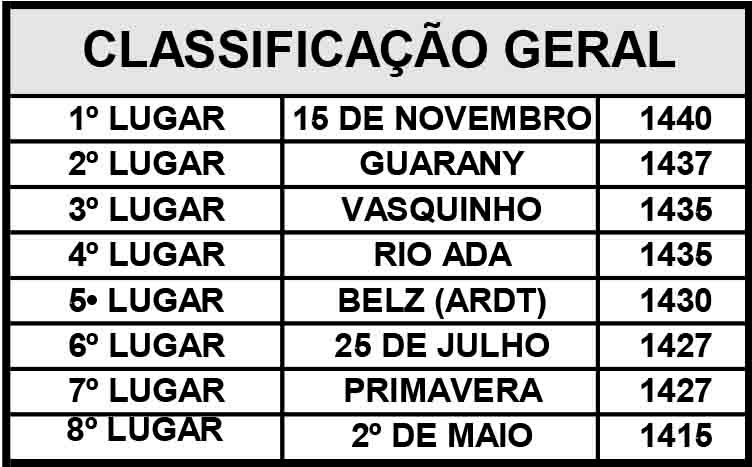 O Primavera ocupou a 6ª posição, somando 714 pontos, seguido pelo 25 de Julho em 7º lugar com 713 pontos. Fechando a tabela, o 2º de Maio ficou na 8ª posição, com 705 pontos. A classificação final revela o equilíbrio entre as equipes, com as posições sendo definidas por detalhes mínimos, o que promete confrontos ainda mais emocionantes na próxima rodada do campeonato.